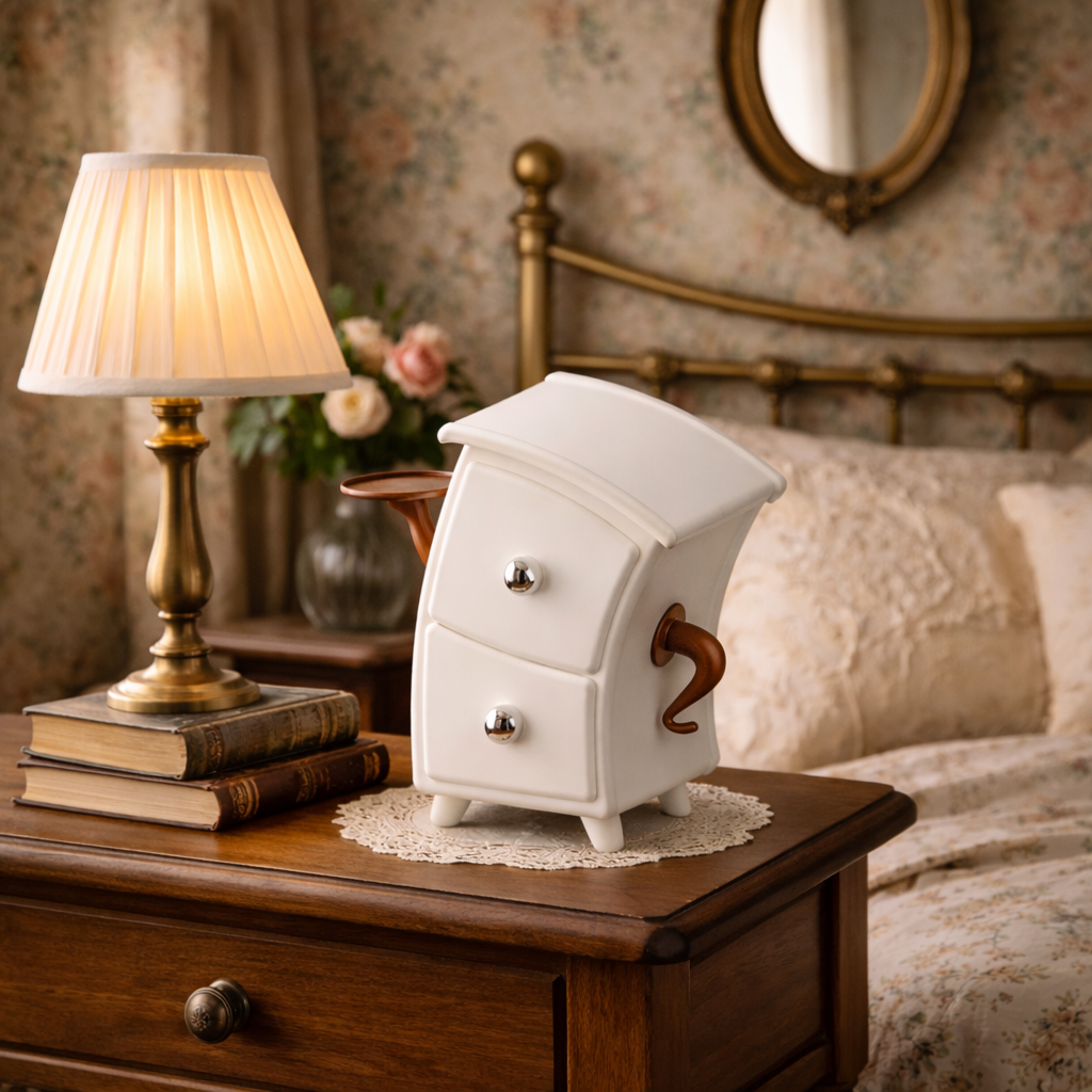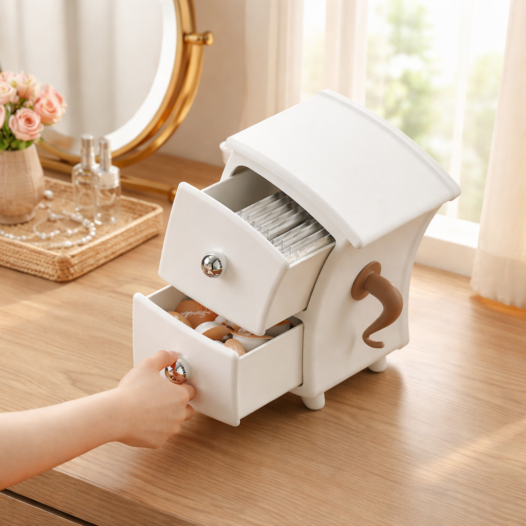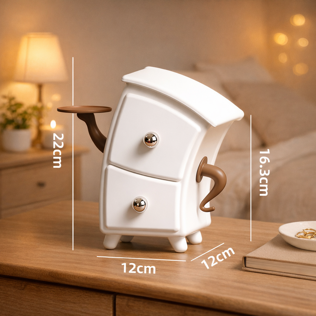 Inspired by classic furniture silhouettes, this compact organizer features soft curves, a cream-white finish, and a charming double-drawer layout. It offers a practical place to store daily essentials—such as jewelry, cosmetics, keys, or small accessories—while adding a subtle decorative touch to your room.